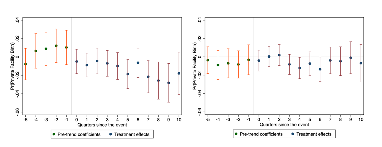 यदि सब्सिडी वाले सार्वजनिक विकल्प से बढ़ती प्रतिस्पर्धा के कारण निजी मातृ स्वास्थ्य देखभाल की दरें कम हो जातीं, तो जेएसवाई के तहत सब्सिडी से उच्च गुणवत्ता वाली निजी सुविधाओं तक पहुँच में सुधार हो सकता था। आकृति-2 (बाएं पैनल) से पता चलता है कि जेएसवाई के चलते सार्वजनिक सुविधाओं में प्रसव के लिए जेब खर्च लागत में 18% की कमी आई। हालांकि, इस प्रतिस्पर्धी दबाव के बावजूद, निजी सुविधाओं ने अपनी कीमतें औसतन बढ़ा दीं, जिससे गरीब माताओं के लिए पहुँच और भी सीमित हो गई। यह वृद्धि उन राज्यों में हुई है जहाँ उच्च सामाजिक-आर्थिक पृष्ठभूमि की माताएँ जेएसवाई सब्सिडी के लिए अपात्र थीं, जिससे निजी सुविधाओं को अपने रोगियों की 'अस्थिर' माँग का फायदा उठाकर कम बाज़ार हिस्सेदारी के प्रभावों का मुकाबला करने का मौका मिला।8
