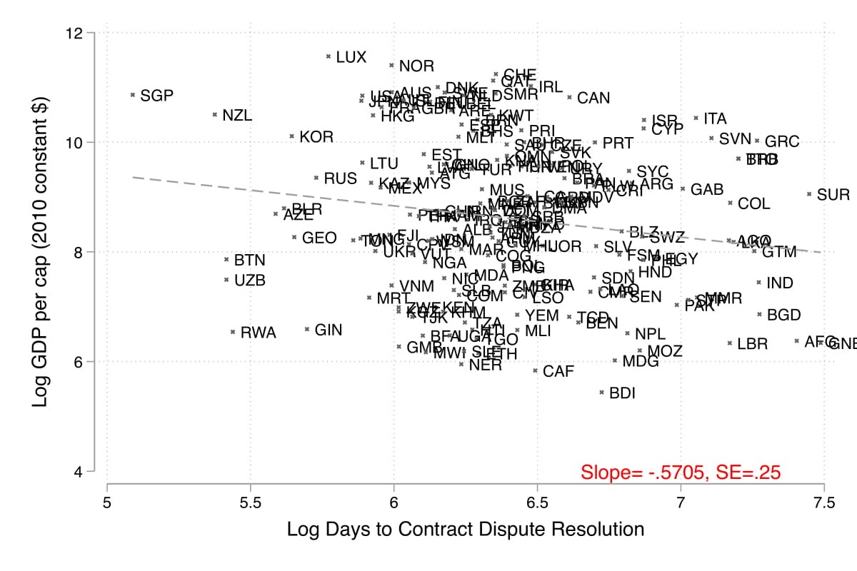 Data source: Cross-country time-series data (2004-2018) from the World Bank’s Doing Business (Trial Duration) and World Development Indicators (GDP).