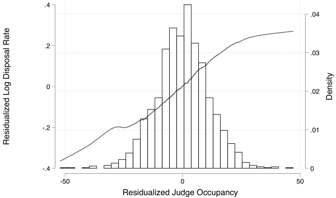 Note: The x-axis and y-axis represents de-meaned judge occupancy (100-judge vacancy) and disposal rate respectively. Therefore, these are centred around 0, which represents their respective mean or average values.