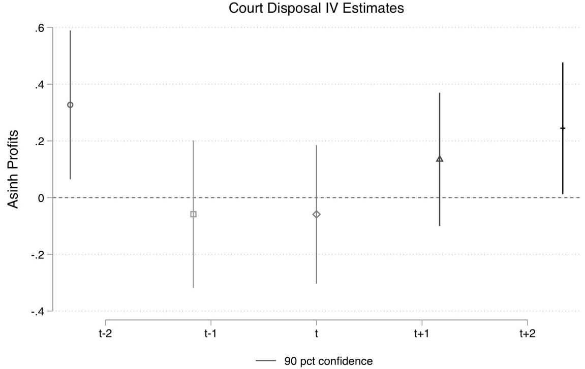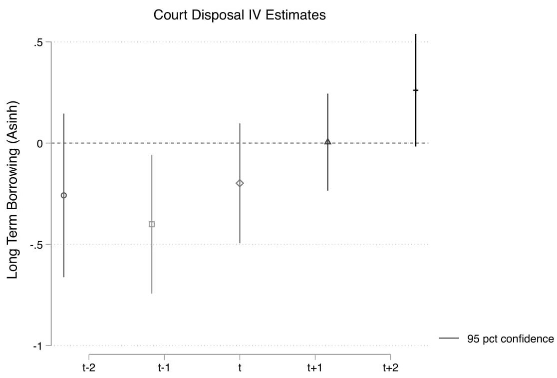 Note: The x-axis presents the time horizon. This shows that an improvement in court disposal rate in a given year (t) affects the outcomes one-two years later. All outcome measures have been transformed so that the estimates can be interpreted in terms of percentage changes when disposal rate increases by 1%. The error bars around the estimates represent a 95% confidence interval, that is, there is a 95% probability that this estimate lies within this range.