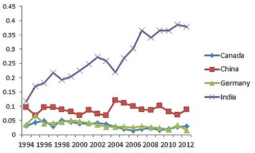 Even as computer science (CS) occupations were growing in the US, the number of CS immigrants was growing faster still. In 1994, the fraction of foreigners in CS occupations was 9%, but rapidly rose to 24% by 2012. This high-skill migration was almost entirely driven by Indians (Figure 1). By 2014, 70% of all H-1B visas, and 86% of all CS H-1Bs were acquired by Indians; with only 5% being awarded to Chinese nationals. Since CS wages are at least 4-10 times higher in the US than in India, the likelihood of migrating abroad raised the expected returns from becoming a computer scientist in India, and more and more students enrolled in engineering colleges – many of which started to offer CS-specific degrees. These students and young workers acquired skills that were now also valued abroad.
