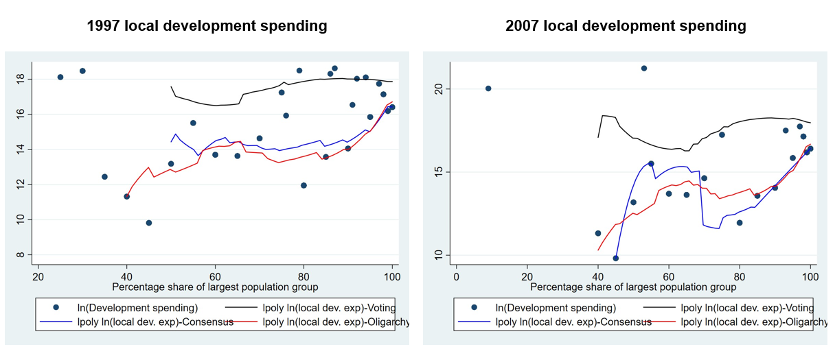 Figure 1 documents the variation in local income and local development spending by local polity (voting, consensus building and oligarchies, where the local leader is elected by local elites or institutions) when plotted against the percentage share of largest population group in 1997 and 2007. In general, higher levels of income and spending are seen in ethnically diverse communities where the most populous group make up a lower share of the population.