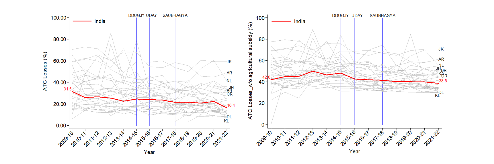 Figure 2. Aggregate technical and commercial losses, including (left) and excluding (right) subsidies from revenue, FY2009-10 to FY2021-22