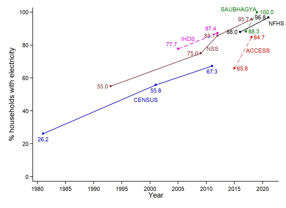 Sources: i) The data for years 1981, 2001 and 2011 are sourced from CENSUS, and covers all the states. ii) The data for years 2015 and 2018 includes ~9000 households that were covered in the ACCESS survey in Bihar, Jharkhand, Madhya Pradesh, Odisha, Uttar Pradesh and West Bengal. iii) Data for 1993, 2009, 2012 and 2018 is from NSS survey (Drinking Water, Sanitation, Hygiene and Housing Condition in India) and indicates the share of electricity used by households for domestic use. iv) Data from 2016 and 2021 was covered under the National Family Health Survey (NFHS) and indicates the share of population living in households with electricity. v) Data from 2017 and 2019 data captured under SAUBHAGYA indicates the share of houses that were electrified under the scheme, from the total unelectrified households identified under the scheme at the time of implementation. vi) India Human Development Survey (IHDS) provides the data for 2005 and 2012, based on a survey across ~42000 households.