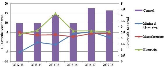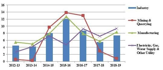 In its report ‘Global Economic Prospects: Darkening Skies’, released in January, the World Bank forecasts India's Gross Domestic Product (GDP) growth at 7.3% for the current financial year, thereby making it the fastest-growing major economy in the world. It states that this growth is underpinned by the strengthening of domestic demand in the midst of an uncertain global environment, with investment growth continuing to consolidate amid GST (goods and services tax) harmonisation and credit rebounds1. Besides, the recent national income data of the Central Statistics Office (CSO) and the Monetary Policy Report (October 2018) of the Reserve Bank of India (RBI) emphasise on the speeding up of industrial activity and firming up of private investment since the year 2017-18. They highlight that the durable rise in real investment activity that is assumed to sustain the growth momentum, has resulted in a sharp acceleration in manufacturing sector growth and consequently expanded the aggregate supply-side of the economy. Figure 1 displays the real growth rate for industry and its sub-sectors.