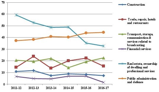 Table 1 below shows that the contribution of industry to real GVA (Gross Value Added)2 growth has declined to just about 20% in 2017-18, two services sub-sectors, namely, ‘public administration, defence and other services’ (PADO) and ‘trade, hotels, transport and communications’, have emerged as significant contributors.