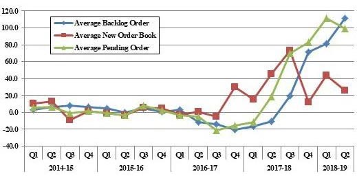If we consider the year-on-year growth in average backlog and pending orders (Figure 6), they exhibit a sharp rise since the beginning of 2017-18, accompanied by the shrinkage of new order books in the previous four quarters. The number of stalled projects has also not shown any improvement in both the private and government sectors. This is supplemented by the following findings of the Centre for Monitoring Indian Economy (CMIE):