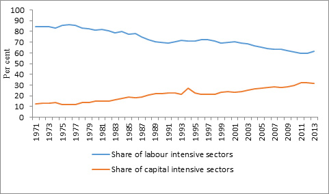 As per the data provided by the 4th Census of MSMEs, almost 86% of the manufacturing MSMEs operating in the country are unregistered. The output data for unregistered manufacturing from the National Account Statistics (NAS) reveals a notable trend in terms of change in output composition of the unregistered manufacturing MSMEs in recent years: the share of sectors with above-average capital intensity in the total output of unregistered manufacturing has steadily risen from 23% in 1991 to close to 33% in 2013, with a commensurate fall in the share of more labour-intensive sectors (Figure 1). The same trend emerges if we look at the relative share of sectors as per the use-based classification: the share of capital goods has steadily increased from 12% in 1971 to 25% in 2013.