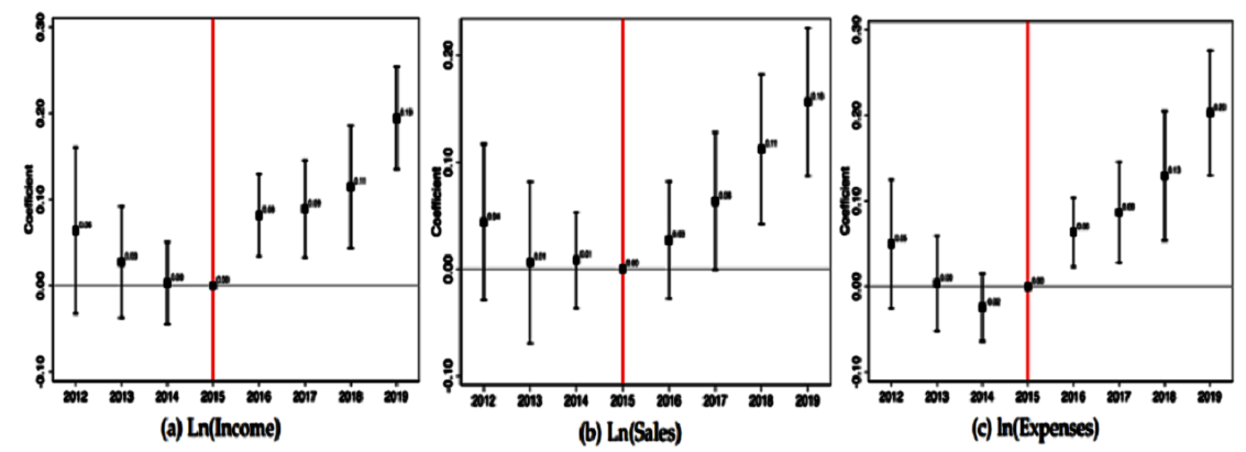 टिप्पणियाँ:  i) उपरोक्त ग्राफ बिक्री, आय और व्यय के लिए राजनीतिक रूप से जुड़ी और गैर-जुड़ी फर्मों के बीच सापेक्ष अंतर का अनुमान लगाने वाले प्रतिगमन गुणांक को दर्शाते हैं।  ii) नोटबंदी (विमुद्रीकरण) से पहले के वर्ष- 2015 - पर अंकित लाल क्षैतिज रेखा आधार वर्ष को इंगित करती है।