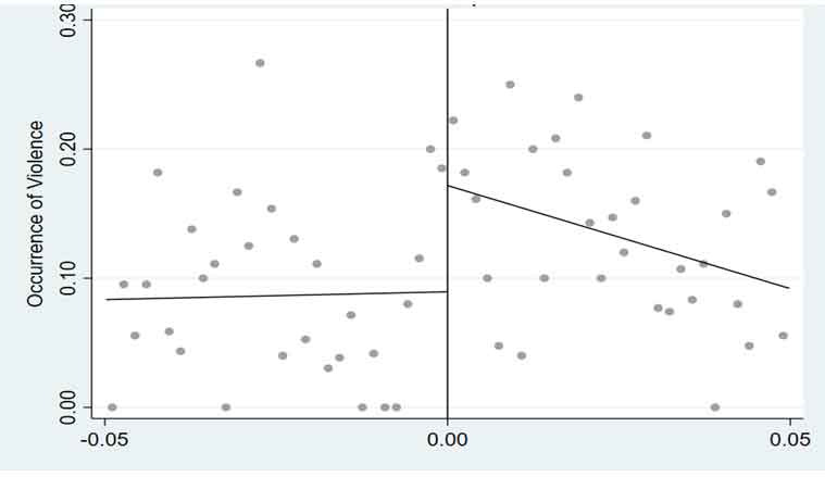 The figure shows a distinct increase in the incidence of violence when a regionalist party candidate narrowly wins an election.4 Specifically, we show that the election of a regionalist party candidate increases the probability of political violence occurring within the boundaries of their constituency by 7.2 percentage points and the number of events involving political violence by more than 10%.