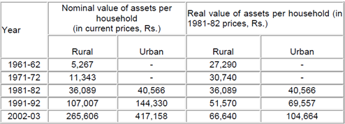 Data on the distribution of household wealth in India are available over 10-year intervals at least from 1961-62, in the surveys on debt and investment conducted by the Reserve Bank of India (RBI) and the National Sample Survey Office (NSSO). Table 1 shows a systematic rise in the average real value of assets held by households. The growth in the value of assets per household is considerably sharper in urban areas as compared to rural areas. From 1981-82 to 2002-03, the average real value of household assets rose by a factor of less than two in rural India, and by more than 2.5 times in urban India. Urban India, after all, is the home of industrial and financial capital, and the growth in the wealth of identifiable corporate houses has been