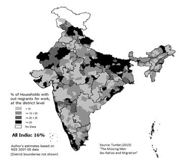Based on the 64th round NSS data, which for the first time captured sufficient information on ‘out-migration’ in 2007-08, I show that nearly one in five rural households has an out-migrant, and the migration is undertaken for work-related reasons. The average rate of out-migration for work among males at the district level was over 5%. To put this in some perspective, this is about the same magnitude experienced by European countries in the Age of Mass Migration in the late 19th century. However, this figure is barely 1% among females reflecting a highly gendered pattern of work-related migration. While a large proportion of adult Indian women are classified as ‘migrants’ because they move locations at the time of marriage, the regional sex ratios are undisturbed to a great extent due to the largely reciprocal nature of these movements. The sex-selective nature of work-related migration however leaves a deeper impression on regional working-age group sex ratios.