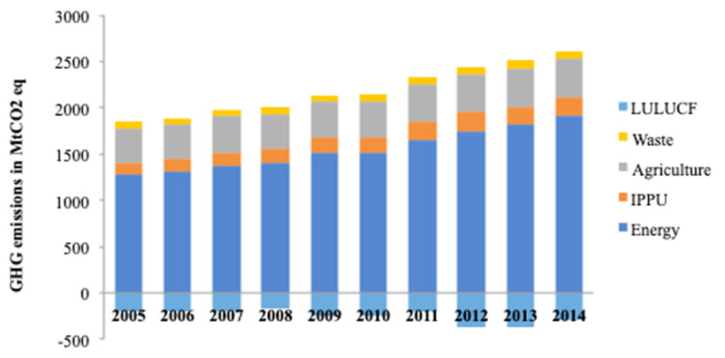 India's total GHG emissions were 1,643 million tonnes of CO2eq. (MtCO2eq.) in 2005. The emissions increased to 2,306 MtCO2eq. in 2014. India's GDP in constant 2011 values for the years 2005 and 2014 was Rs. 58 trillion and Rs. 103 trillion, respectively (Central Statistics Office (CSO), 2018). The ratio of total GHG emissions to GDP is the GHG emission intensity. India’s GHG emission intensity declined from 0.028 kgCO2eq./Rs. in 2005 to 0.022 kgCO2eq./Rs. in 2014. These estimates confirm that India's GHG-emission intensity declined by 21% in 2014, from 2005 levels.