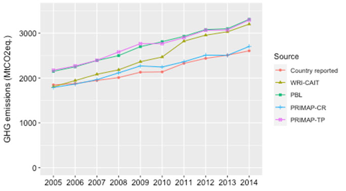 The data submitted by countries to UNFCCC in national communications and biennial update reports are known as the ‘country-reported data’. Country-level emission database has also been developed by several organisations, such as the World Resources Institute Climate Analysis Indicators Tool (WRI-CAIT), Netherlands Environmental Assessment Agency (PBL), World Bank, etc. The data other than the country-reported data is referred to as ‘third-party datasets’. The third-party datasets combine emissions data from different sources and employ modelling tools to provide missing values in the dataset. I took the PRIMAP-hist dataset, developed by Postdam institute, that includes both country-reported (PRIMAP-CR) data and third-party (PRIMAP-TP) estimates. According to this dataset, the third-party estimates are 22% higher than the country-reported estimates. Further, the decline in GHG emission intensity from the third-party dataset is 15% in 2014 from 2005 levels as compared to 21% from country-reported data. The GHG emissions (excluding LULUCF) from some of the datasets are plotted in Figure 2.