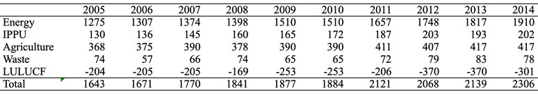 The ‘time series’ of aggregate GHG emissions from 2000 to 2014 is available as a bar graph in BUR-2. The bar graph shows emissions of all GHGs estimated in CO2eq. by individual sectors. There are five individual sectors: energy; industrial process and products use (IPPU); agriculture; waste; and land use, land-use change, and forestry (LULUCF). These are the sole time-series data available from government reports. I extracted the data from the bar graph using a web-based tool. The data is shown in Table 1 and plotted in Figure 1.