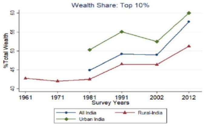 Figure 1. Wealth share of the top 10% in India, 1961-2012