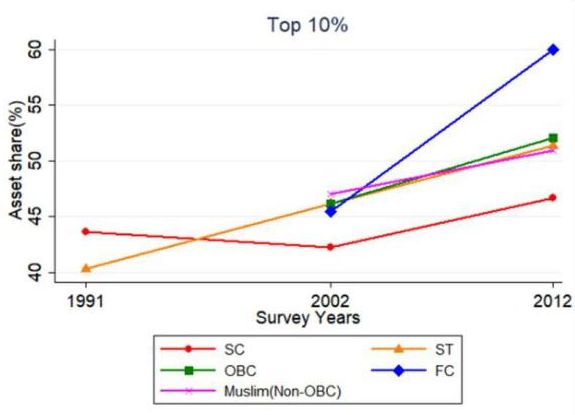 Next, it is crucial to look at inequality within the caste groups because any grouping inherently assumes homogeneity within that caste group. We observe that within every caste group, the wealth share of the top 10% is more than 45%. FC is an outlier with highest within-caste inequality (Figure 3). This points towards the existing heterogeneity within these caste groups and this has increased in recent decades. A repercussion of increasing within-FC inequality is the evolving demand for reservation/quotas from sub-castes within FC groups, which was limited to OBC/SC/ST4. The government responded to the demand by providing 10% reservation to economically weaker sections.