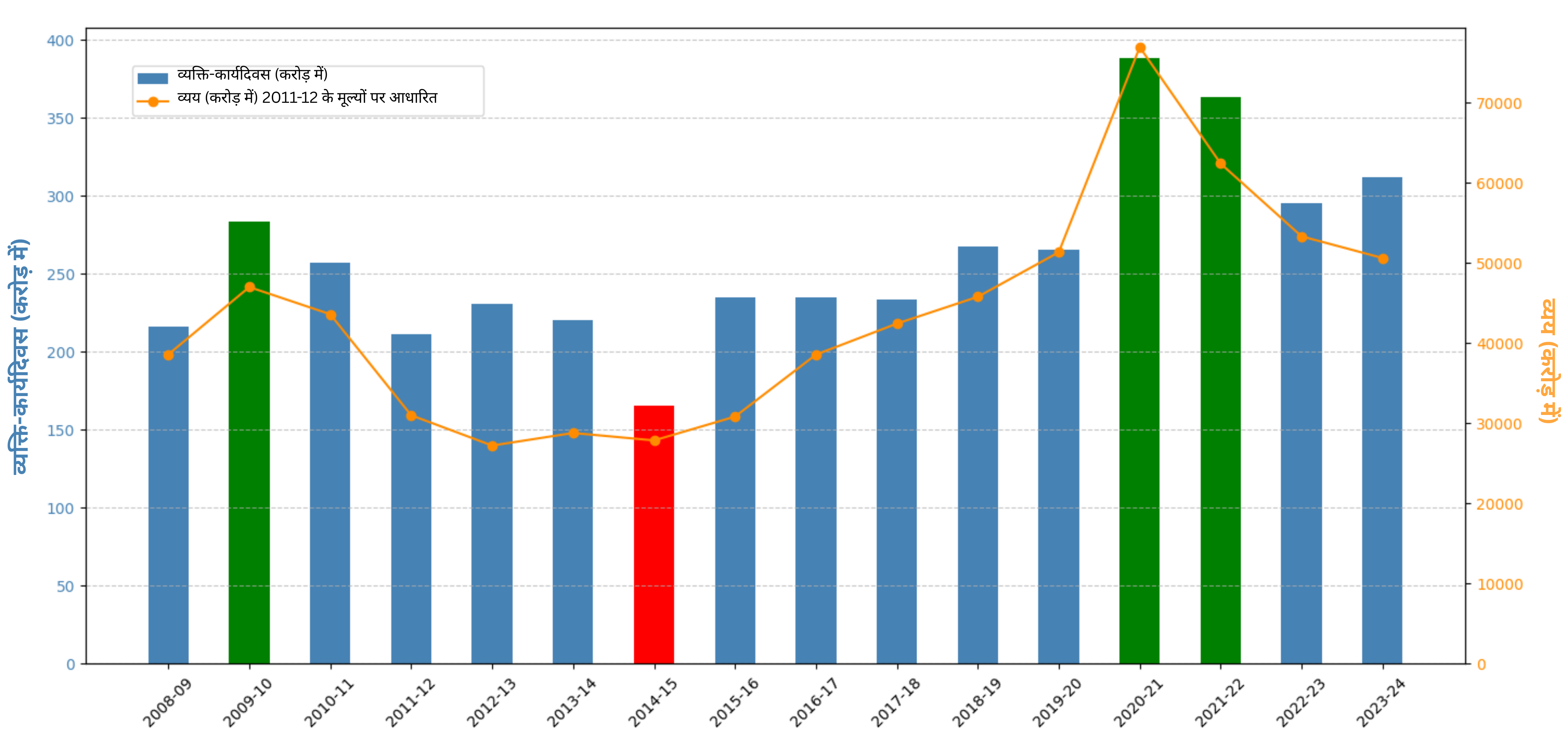 स्रोत : रोज़गार के आँकड़े भारत सरकार (2013), शीट 1, वर्ष 2011-12 तक ; भारत सरकार (2015) के वर्ष 2012-13 और 2013-14; मनरेगा-एमआईएस, रिपोर्ट R5.1, वर्ष 2014-15 से आगे के हैं। व्यय के आँकड़े (केवल केन्द्र सरकार के) वार्षिक केन्द्रीय बजट (संशोधित अनुमान) दस्तावेज़ों से लिए गए हैं और जीडीपी डिफ्लेटर के साथ घटाए गए हैं।