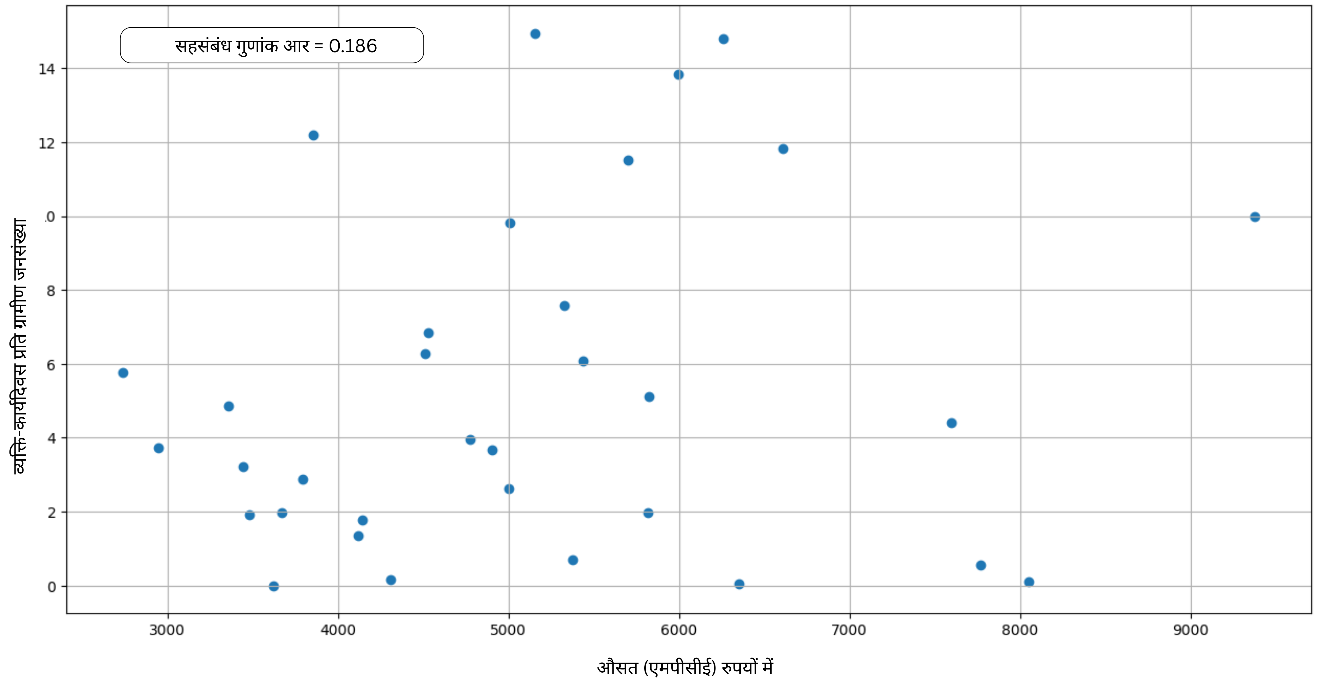 तथ्य यह है कि राज्यों में ‘रिवर्स टारगेटिंग’ का कोई प्रमाण उपलब्ध नहीं है। यह बात आकृति-3 में स्पष्ट है, जिसमें 2023-24 सन्दर्भ वर्ष है। इस चार्ट में, हमने उस वर्ष के गरीबी अनुमानों के अभाव में, ग्रामीण क्षेत्रों में मासिक प्रति व्यक्ति व्यय (एमपीसीई) के एनएसएस अनुमानों के सामने प्रति व्यक्ति मनरेगा रोज़गार को दर्शाया है। दोनों के बीच कोई महत्वपूर्ण सह-सम्बन्ध नहीं है।15 वर्ष 2009-10 और 2011-12 के बारे में ग्रामीण गरीबी अनुमान उपलब्ध हैं, लेकिन एक बार फिर, उनका प्रति व्यक्ति मनरेगा रोज़गार से कोई विशेष सम्बन्ध नहीं है।