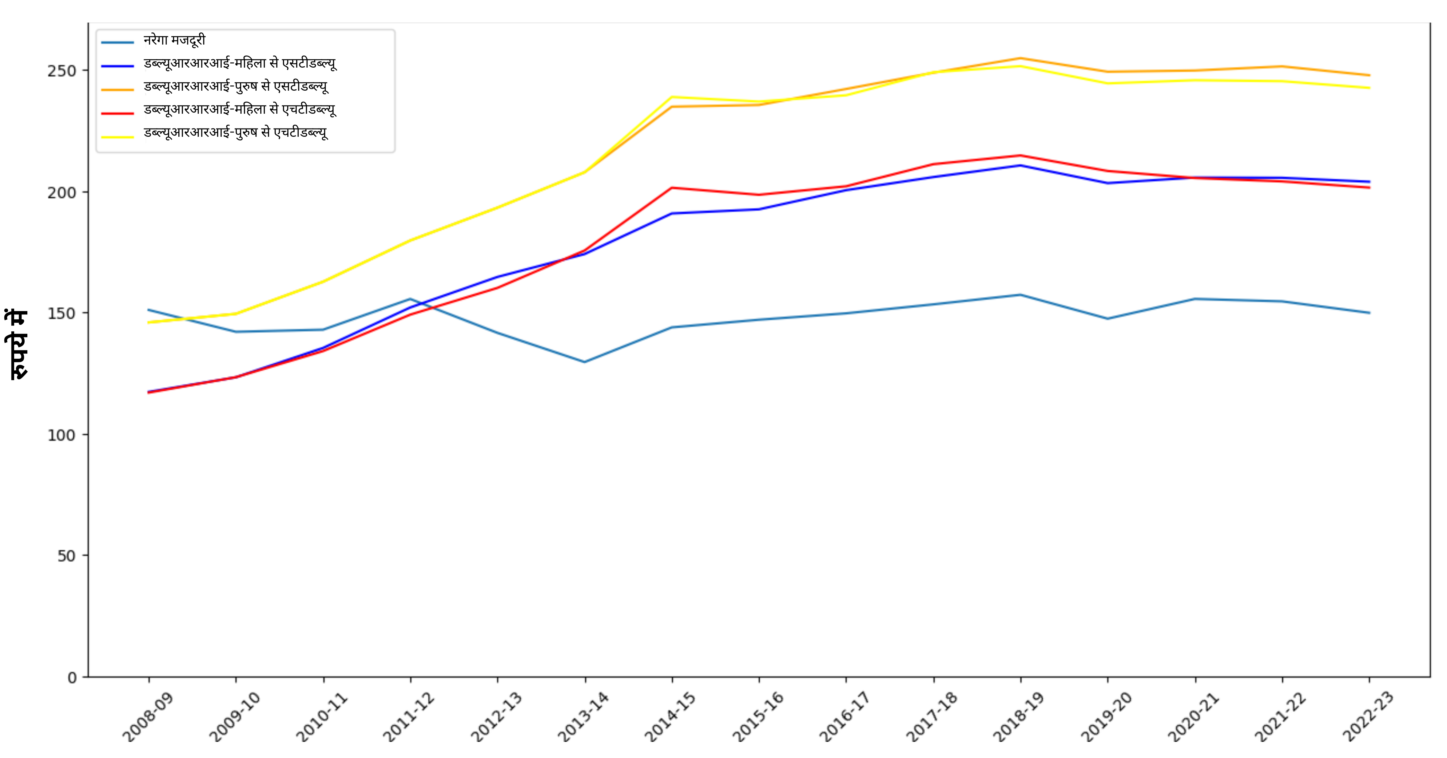 इस चार्ट में, अखिल भारतीय मनरेगा मज़दूरी के आँकड़े या तो सीधे एमआईएस से या जब प्रत्यक्ष जानकारी उपलब्ध न हो तो कुल मज़दूरी व्यय को मनरेगा रोज़गार के व्यक्ति-दिवसों की संख्या से विभाजित करके (दोनों विधियाँ उन वर्षों में बहुत समान परिणाम देती हैं जहाँ प्रत्यक्ष जानकारी उपलब्ध है) लिए गए हैं। स्त्री-पुरुषों की कृषि मज़दूरी की गणना तीन व्यवसायों के अनिर्धारित औसत के रूप में की गई है, जो कृषि संबंधी प्रारंभिक गतिविधियों (बुवाई, रोपाई, निराई) और कटाई के समय की गतिविधियों (कटाई, गहाई, फटकना) के लिए अलग-अलग है।19 दोनों प्रकार की गतिविधियों के लिए ये लगभग समान होती हैं। सभी प्रकार की मौद्रिक मज़दूरी को सीपीआई-एएल का उपयोग करके वर्ष 2014-15 के मूल्यों पर वास्तविक मज़दूरी में परिवर्तित किया गया है।