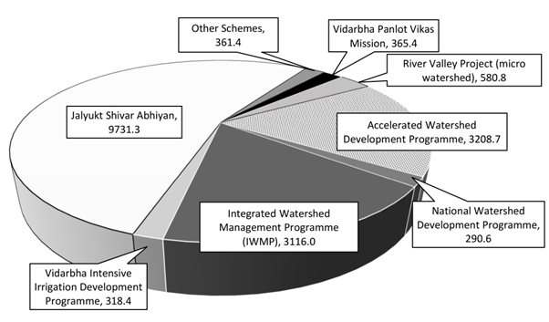 Jalyukt Shivar Abhiyan (JSA): The JSA was launched in 2014 as the flagship programme of the state of Maharashtra, with the promise of tackling the drought permanently by 2019. The scheme aimed at making 25,000 villages drought-free, at the rate of 5,000 villages per year (Government of Maharashtra, 2014). The approach included preparing a village-level water budget and action plan in consultation with the Gram Panchayat (village council) and implementing the same within a year. The state government spent Rs. 9,731.3 crore on this ambitious scheme, surpassing the total expenditure of all other central and state-funded micro-watershed programmes implemented in Maharashtra (Figure 1).