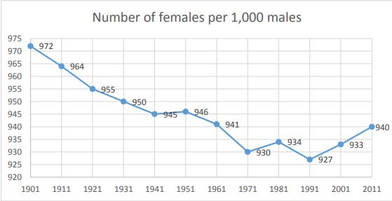 However, this is not just an at-birth phenomenon. Anderson and Ray (2012) find that there are missing women at every age. Figure 1 plots sex ratio, defined as the number of females per 1,000 males, in India since 1901. Ironically, there were more females per 1,000 males in 1901 (and until 1961) than today. Sex ratio in 2011 is roughly the same as 50 years ago in 1961. This is a worrying trend because Indians are, on average, both richer and more educated than they were 50 years ago. Shockingly, it has actually declined in many states despite improvements in literacy rates in those states over the same time period.1 An important question for policymakers then is: Can we identify the factors that determine the cultural norms underlying son preference, and gender inequality in general, that may be responsible for the missing women in India and elsewhere?