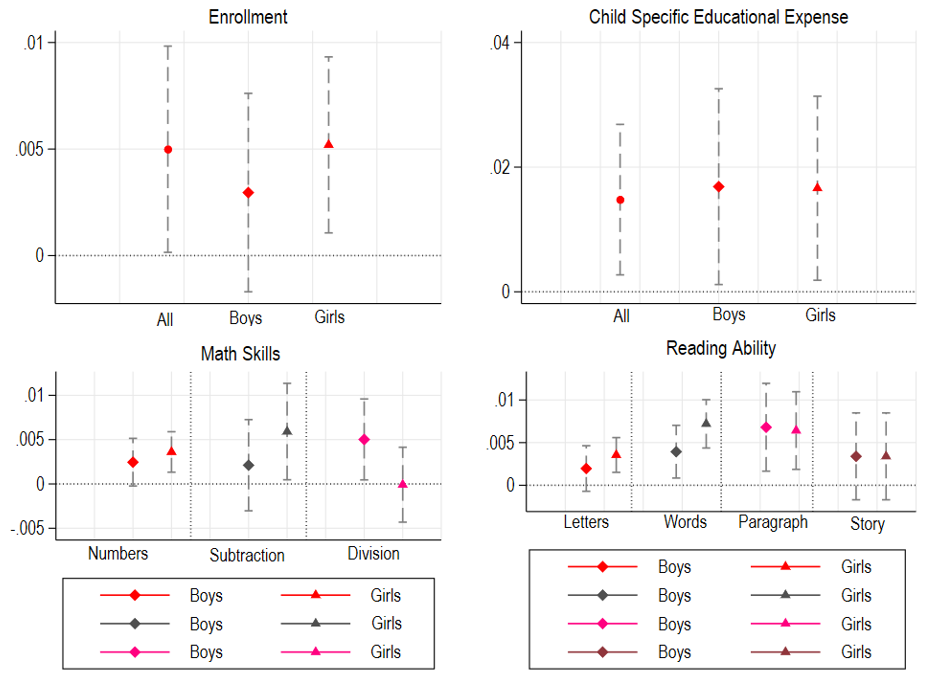 हमारे निष्कर्षों से पता चलता है कि उन गाँवों में समग्र नामांकन में 4.5% की वृद्धि और बाल-विशिष्ट शैक्षिक व्यय में 14% की वृद्धि हुई है जो बेसलाइन आईपीडीडब्ल्यू तीव्रता (नियंत्रण) के सन्दर्भ में उच्चतम चतुर्थक वाले गाँवों के सापेक्ष सबसे कम चतुर्थक (उपचार) में थे।2 इसके अतिरिक्त, हमने ‘नियंत्रण’ गाँवों की तुलना में ‘उपचार’ गाँवों में स्कूली बच्चों की पैराग्राफ पढ़ने की क्षमता में 6.3% सुधार और कहानी पढ़ने की क्षमता में 20% सुधार देखा है।
