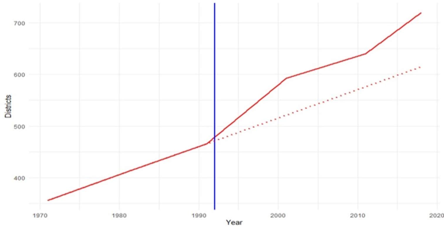 अधिक जिलों का निर्माण करने की दिशा में एक सुस्पष्ट प्रवृत्ति रही है, जिसने 1992 में पंचायती राज संशोधन2 के बाद से और गति पकड़ी है (चित्र 1 देखें)। सैद्धांतिक रूप से विकेंद्रीकरण सुधार लागू होने से, प्रत्येक उप-राष्ट्रीय इकाई को नियंत्रित करने से लाभ बढ़ेंगे और यह स्थानीय अभिजात वर्ग के लिए नई इकाइयों (ग्रॉसमैन और लुईस 2014) के निर्माण की मांग करने के लिए प्रोत्साहित करता है।