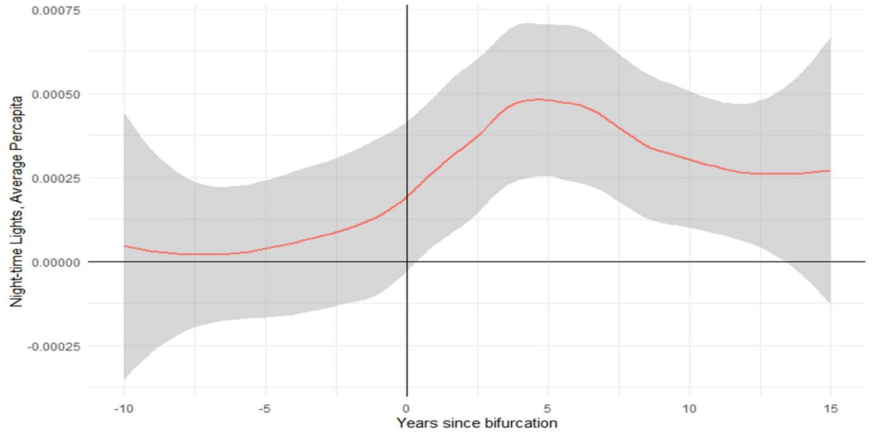 विभाजित जिलों में विभाजन और असमानता दोनों अधिक थे, और अंतर सांख्यिकीय रूप से महत्वपूर्ण थे। इसी तरह, हमने विभाजन से पहले के क्षेत्रों के आर्थिक परिणामों की तुलना एक ऐसे संकेतक का उपयोग करके की, जो यह मापता है कि उप-जिले में औसत नाईट-टाइम लाइट (रात्रि-कालीन आर्थिक गतिविधि) उस जिले की तुलना में अधिक है, जिसका वह हिस्सा है। एक विभाजित जिले के अन्दर, उच्च स्तर की असमानता और आर्थिक परिणामों के निचले स्तर के हाशिए वाले क्षेत्रों के अलग होने और भविष्य में उनके एक नया जिला बनने की संभावना है।
