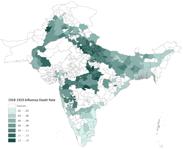 The Influenza pandemic of 1918 killed around 50 million people globally. Over 13 million of those who died were in India, close to 5% of the country’s total population (Chandra et al. 2012). The pandemic began in the Bombay region and spread to the north and east. It disproportionately killed individuals of working age (20-45 year olds) and was concentrated in districts that experienced less-than-normal levels of humidity. In recent research, we study the short- and medium-run effects of this major demographic shock on women's employment (Fenske et al. 2020).