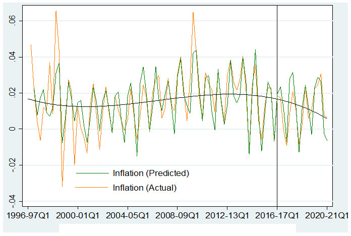 Figure 1 presents the inflation forecasts for the period after 2016 using the structuralist model. The model was estimated from the first quarter of 1996-97 to the fourth quarter of 2015-16, and used to predict CPI inflation during the period from the first quarter of 2016-17 to the first quarter of 2020-21. The out-of-sample forecasts are the points beyond the vertical line, drawn at the first quarter 2016-17. Note that, as may be seen from the fitted trend line, our model predicts lower inflation from 2016. A reasonably strong correlation (0.79) is estimated between the actual and predicted values, indicating predictive power of the structuralist model.7