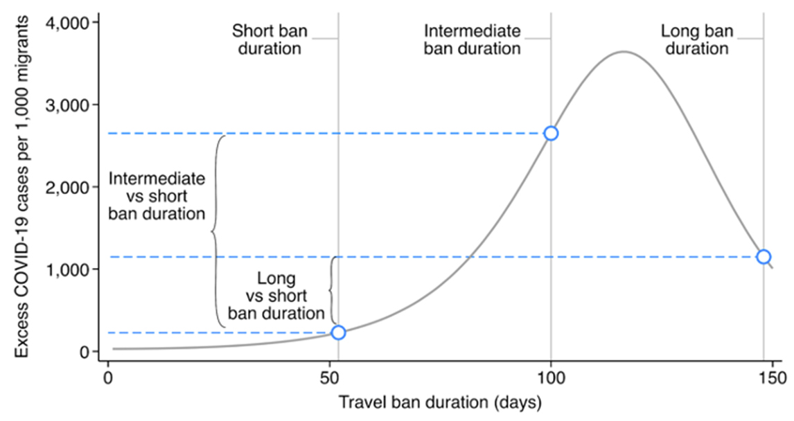 Notes: (i) This figure plots SEIR model simulations of cumulative excess rural sink infections per 1,000 migrants (vertical axis) following the release of travel bans of varying durations (horizontal axis). (ii) We compare excess rural sink cases to a counterfactual in which migrants leave the source immediately. (iii) Vertical grey lines mark hypothetical short, long, and intermediate bans; blue markers indicate excess cases caused by bans of these lengths. (iv) Brackets compare intermediate and long bans with a short ban.