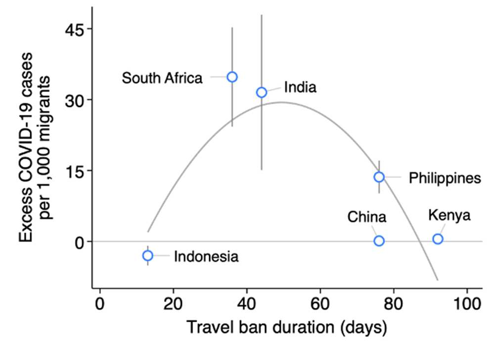 Notes: (i) The figure shows excess Covid-19 cases per 1,000 hotspot migrants 30 days after each country's travel ban release. (ii) 90% confidence intervals are shown in grey vertical bars. (iii) ‘Parabolic curve’ is an unweighted quadratic function fit to the estimate for each country.