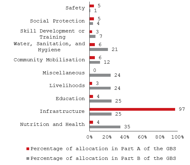 Looking at allocations in Part B, 35% of overall allocations were for nutrition and health, followed by infrastructure, education, and livelihoods. Several schemes also do not present a clear scope for targeting women and girls through the GBS.