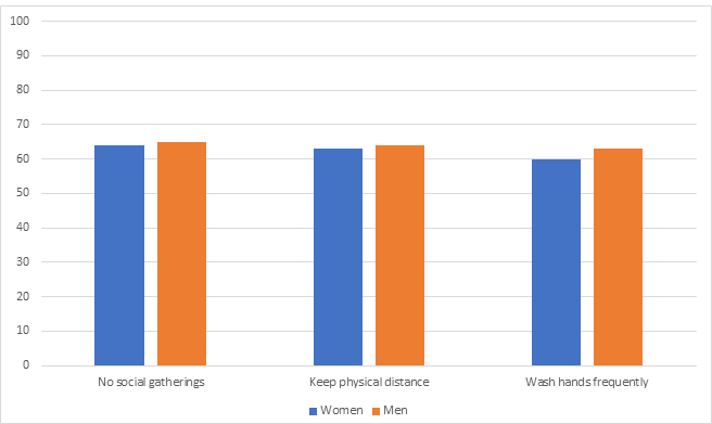 In terms of adherence to personal hygiene and social distancing norms, over 60% of both genders strongly agree with the statement that people living near them are not attending social gatherings, practicing social distancing, and washing hands frequently. However, 82% of the respondents report that they did venture outside their home in the past week. The main reason (93%) to leave the house was to purchase groceries and other essential items.
