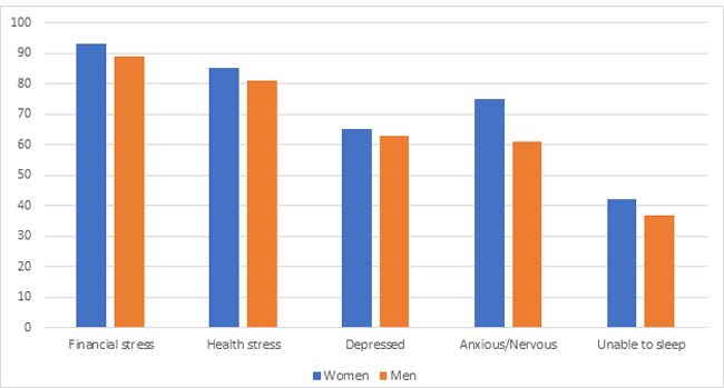 In our sample, almost 85% of the women report feeling worried about the physical health of their families compared to 81% of men. 63% of men report feeling depressed about their situation while 65% of women do so. Strikingly, both men and women worry more about their family’s financial adequacy than about their health, though the difference is not significant. Almost 75% of women felt anxious or nervous about the current situation compared to 61% of men, and more than 1/3rd of both women and men have trouble getting adequate sleep. Across the board, women appear to be more stressed than men.