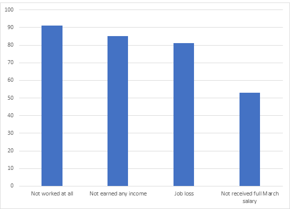 Our main survey indicates a massive shock to the livelihoods and wage earnings of these families. As expected, the vast majority of the workers in these residential areas (91% of the men) have been completely unable to work. Around 85% of the respondents who were employed before the lockdown have not earned any income from their main occupation while over half (53%) of those who were employed before 24 March did not receive their full salary for the month of March.