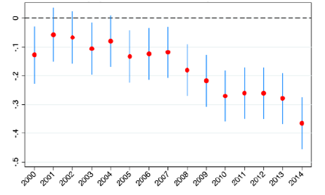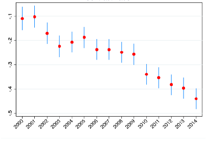 - Adapting the model from De Loecker and Warzynski (2012), we can derive the change in the factor adjustment cost from data through the change in the ratio of input expenditures. Since we are mainly interested in how the adjustment cost varies over time by state, we regress the ratio of firm-level input shares on firm fixed effects and year dummies interacted with state dummies. The firm fixed effect absorbs the time-invariant output elasticity ratio (ratio of output elasticity with respect to one input, and output elasticity with respect to another input) and other time invariant components of the adjustment cost. Thus, the regression identifies how the adjustment cost has changed relative to the baseline year, and how that change varies by state.