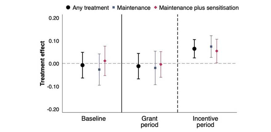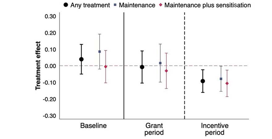 The maintenance intervention generated sustained improvements in the observed quality of facilities, accompanied by a significant reduction in free riding among users by 18 percentage points compared to the control group (Figure 1). These effects emerged only after the period in which the maintenance grant was offered (grant period), and once caretakers were incentivised financially to deliver higher quality (incentive period). This result is in line with other studies showing that cash incentives matter in the social and public sector (Bandiera et al. 2012, Burgess et al. 2012).