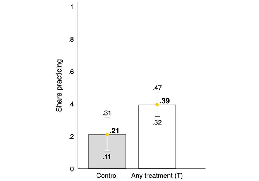 Notes:(i) The figure shows the share of slum residents practising open defecation the day before the interview, estimated using a ‘list-randomisation’ technique. Shares are estimated as the difference in the number of items reported as ‘true’ by respondents who faced a long list (which includes the sensitive behaviour), and the respondents who faced a short list (which excludes the sensitive behaviour). We compute this average separately in the control group and in any treatment group. (iv) Confidence intervals are built using statistical significance at the 10% level.