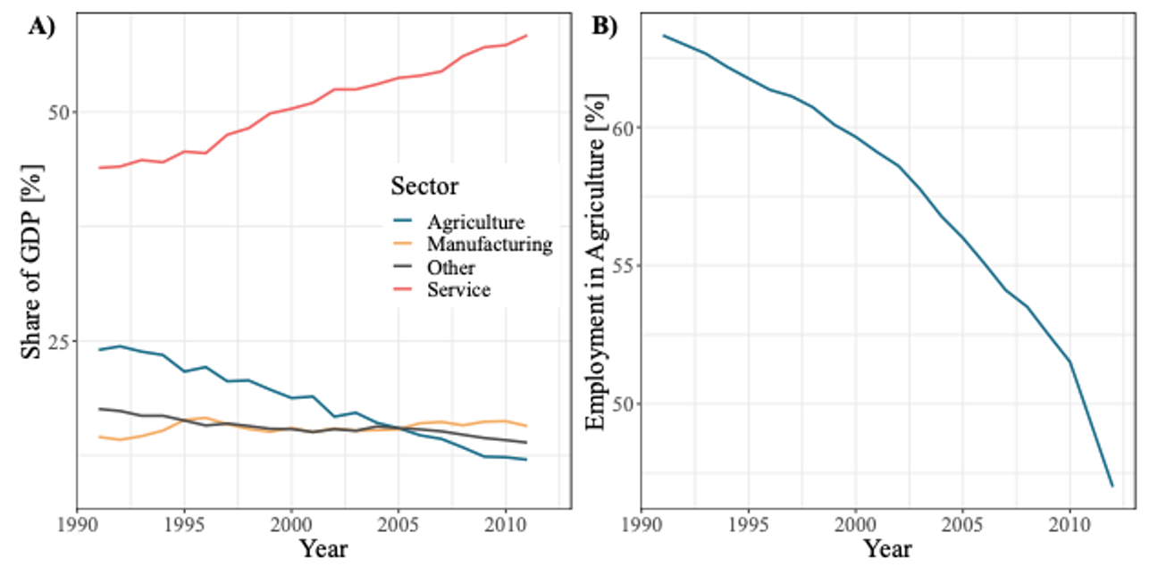 The migration of workers from farms to cities is a hallmark of economic development. For instance, India’s 1991 economic liberalisation led to a 30% drop in the share of the workforce employed in agriculture alongside a rapid expansion of service jobs in urban areas (Figure 1). While development economists have extensively studied migrants and their urban destinations, less is known about how their departure transforms the rural economies they leave behind.