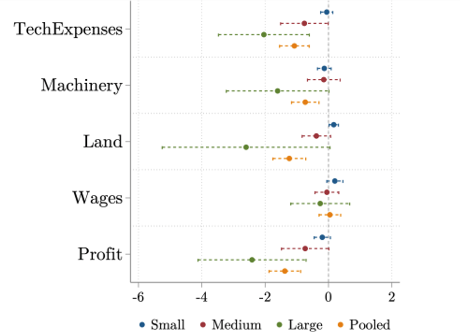 We find that downsizing is driven by large farms (Figure 3, green), consistent with our stylised fact that these farms are more labour-constrained. Small farms, which are characterised by surplus workers, show little response, as the departure of underutilised workers has little effect on production.