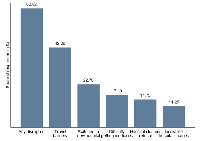 Over 62% of patients report a disruption in access to dialysis care due to the lockdown (Figure 1). Travel barriers were the most common cause of disruptions. Interviews suggest that difficulties finding transport and requirements to show proof of official approval of travel exemptions for hospital visits, were contributing factors. Patients also faced hospital closures, service refusals, and increased charges. Twenty three per cent of patients had to switch to a different hospital from the one they typically visit. Although the lockdown was universal, its effects on care access were worse for lower-caste and poorer patients and those living further away from a hospital. Structured interviews with hospitals confirm patient reports, but also suggest that hospitals faced their own constraints – most hospitals reported large decreases in patient volumes due to travel barriers, and many had to close down due to staffing and supply shortages.