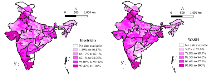 Figure 3. District-level share of primary schools with electricity and WASH facilities (in 2020-21)