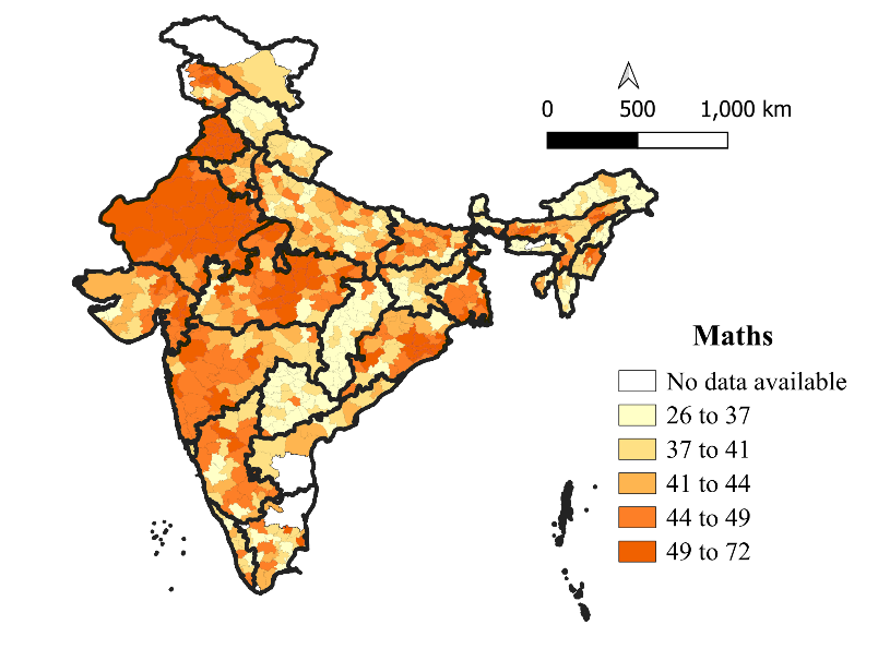 At the same time, districts with a large ST population in Gujarat, Maharashtra, Madhya Pradesh, and Rajasthan show a mixed pattern. Tribal districts of Alirajpur and Jhabua, on the western border of Madhya Pradesh, perform poorly on the learning tests. Both of these districts have a tribal population of more than 80%. However, Nandurbar (in Maharashtra), with an ST population of 69.2%, performs above average on both language and math tests.