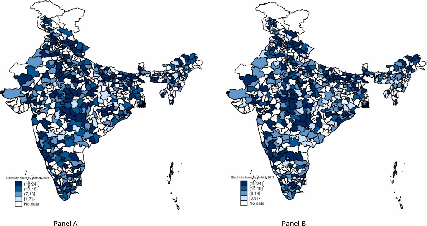 Note: Reliability of electricity is measured by district-level average electricity hours. Darker blue implies higher average hours.