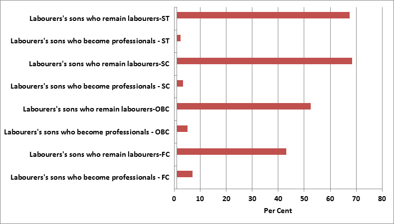 Note: The percentage of sons of fathers who were labourers who (a) remain labourers and (b) become professionals. FC=Forward Caste, OBC=Other Backward Classes, SC=Scheduled Castes, ST=Scheduled Tribes. Downward mobility risks