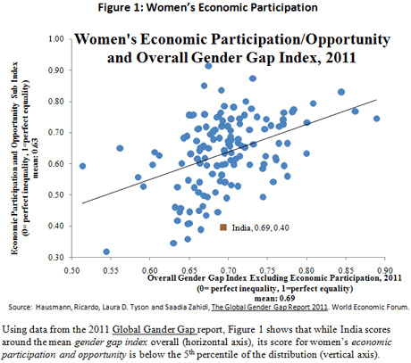 The UN Gender Inequality Index has ranked India below several sub-Saharan African countries. Gender disparities are even more pronounced in economic participation and women’s business conditions in India. Using data from the 2011 Global Gender Gap report, Figure 1 shows that while India scores around the average of the gender gap index overall (horizontal axis), its score for women’s economic participation and opportunity is worse than 95% of all countries in the sample (vertical axis). Despite India being the second fastest growing economy in the world, gender disparities have remained deep and persistent in India.