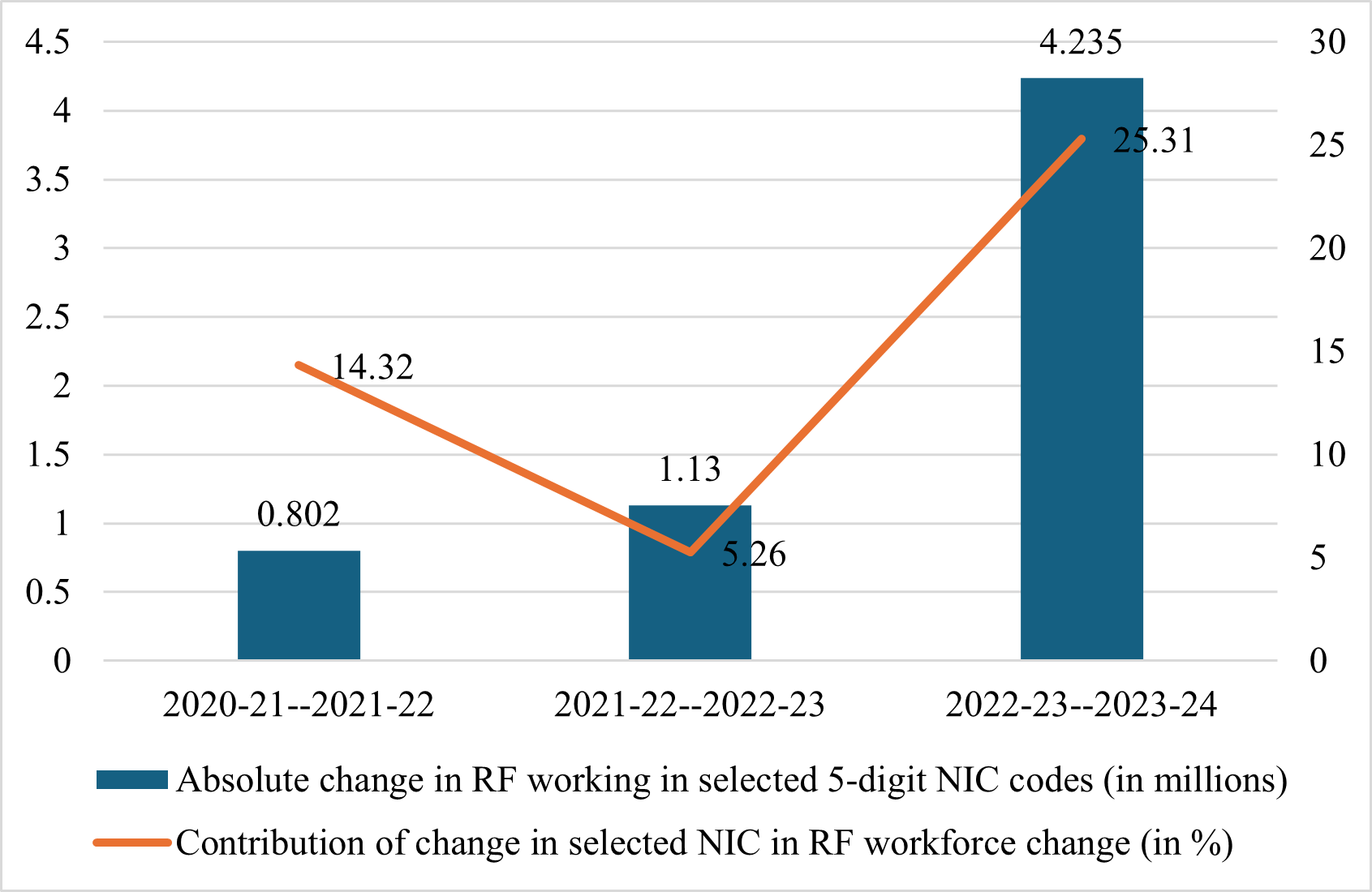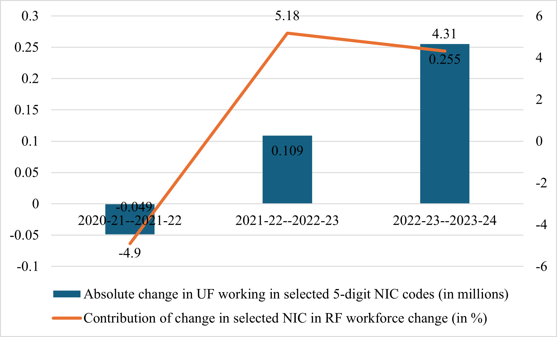 Even though it is difficult to capture the exact contribution of revised instructions in the rise of women’s WPR in 2023-24. However, the fall in women’s real earnings in 2023-24 in selected NIC codes further corroborates the argument that enumeration-based changes in workforce classification along with distress-led employment diversification largely catalysed such a rise.