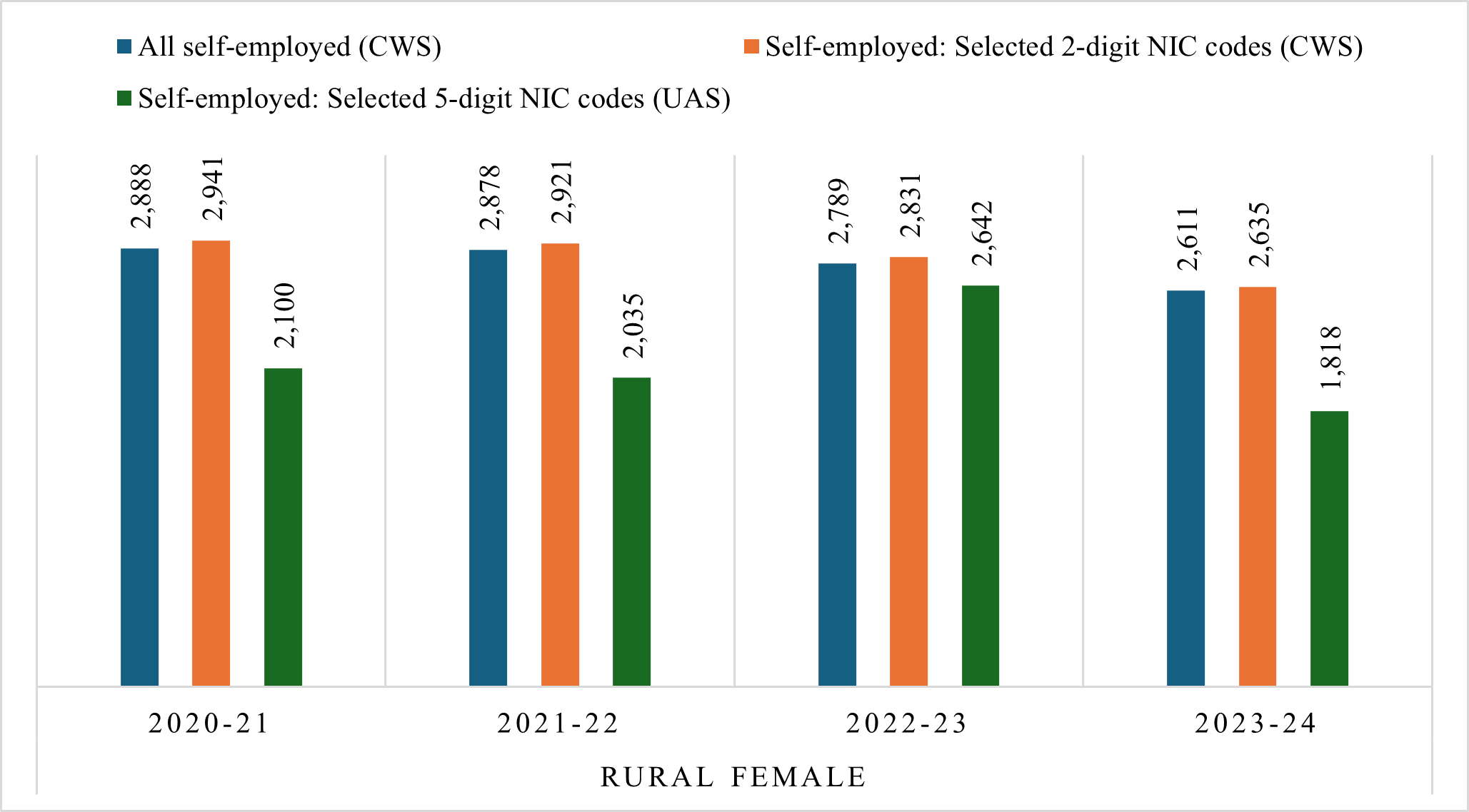 PLFS only records a 2-digit NIC code4 for Current Weekly Status (CWS), per which gross earnings (for the last 30 days) are recorded. Hence, we have taken corresponding 2-digit NIC codes encapsulating all 12 activities in the previous section under their broad industry heads.5 However, that would be an approximation only. Therefore, to arrive at more accurate estimates, we have imputed the earnings of self-employed women in the 12 5-digit NIC codes as per UAS.